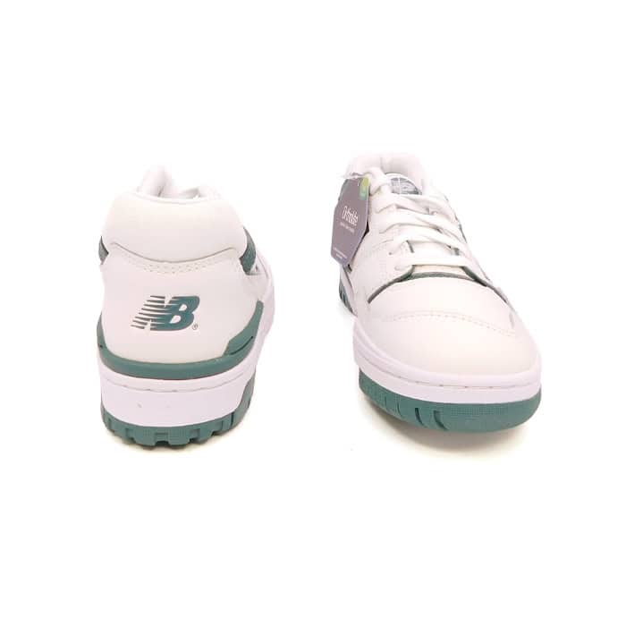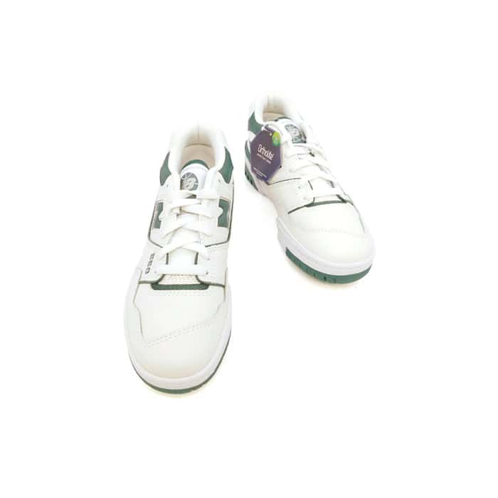 Sneaker in vitello bianco con inserti verdi. Fondo in gomma bicolore. Modello: BB550PI.