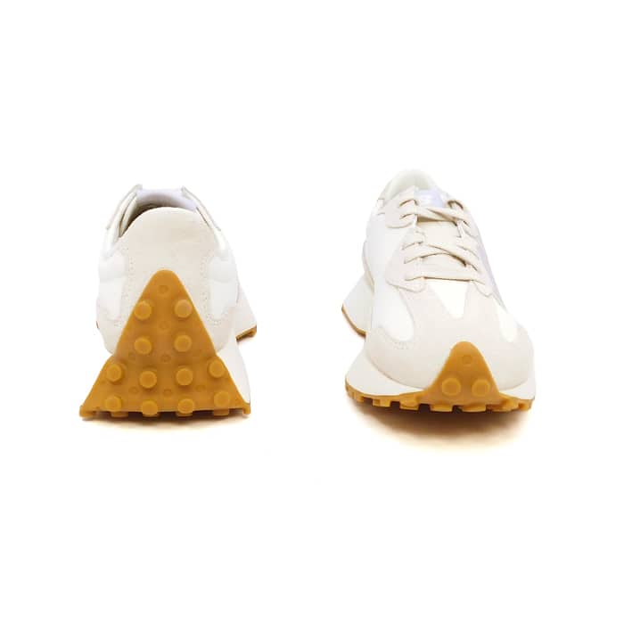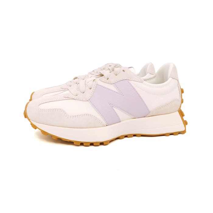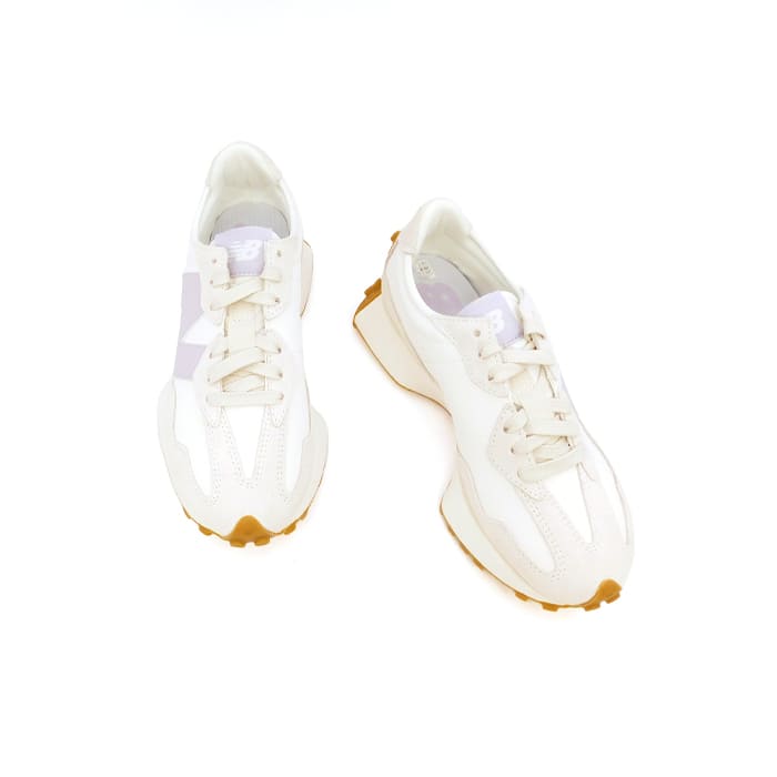 Sneaker in vitello bianco e camoscio tortora con dettaglio logo lilla. Fondo in gomma bicolore. Modello: 327KB.