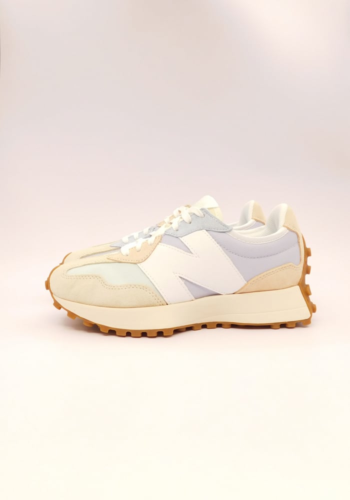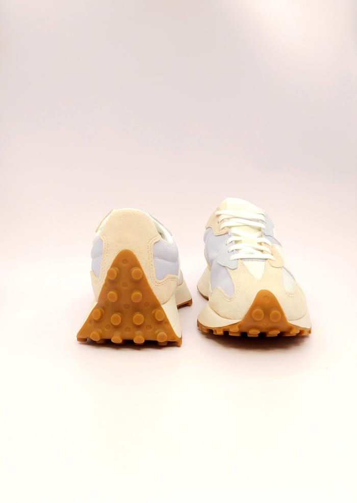 Sneaker in tessuto tecnico celeste e camoscio beige. Logo laterale bianco. Fondo 2 cm in gomma.