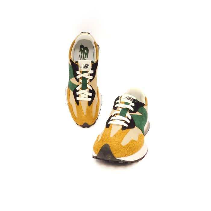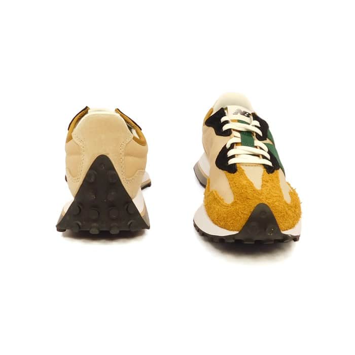 Sneaker in tessuto tecnico beige e camoscio senape. Logo laterale verde. Fondo 2 cm in gomma.