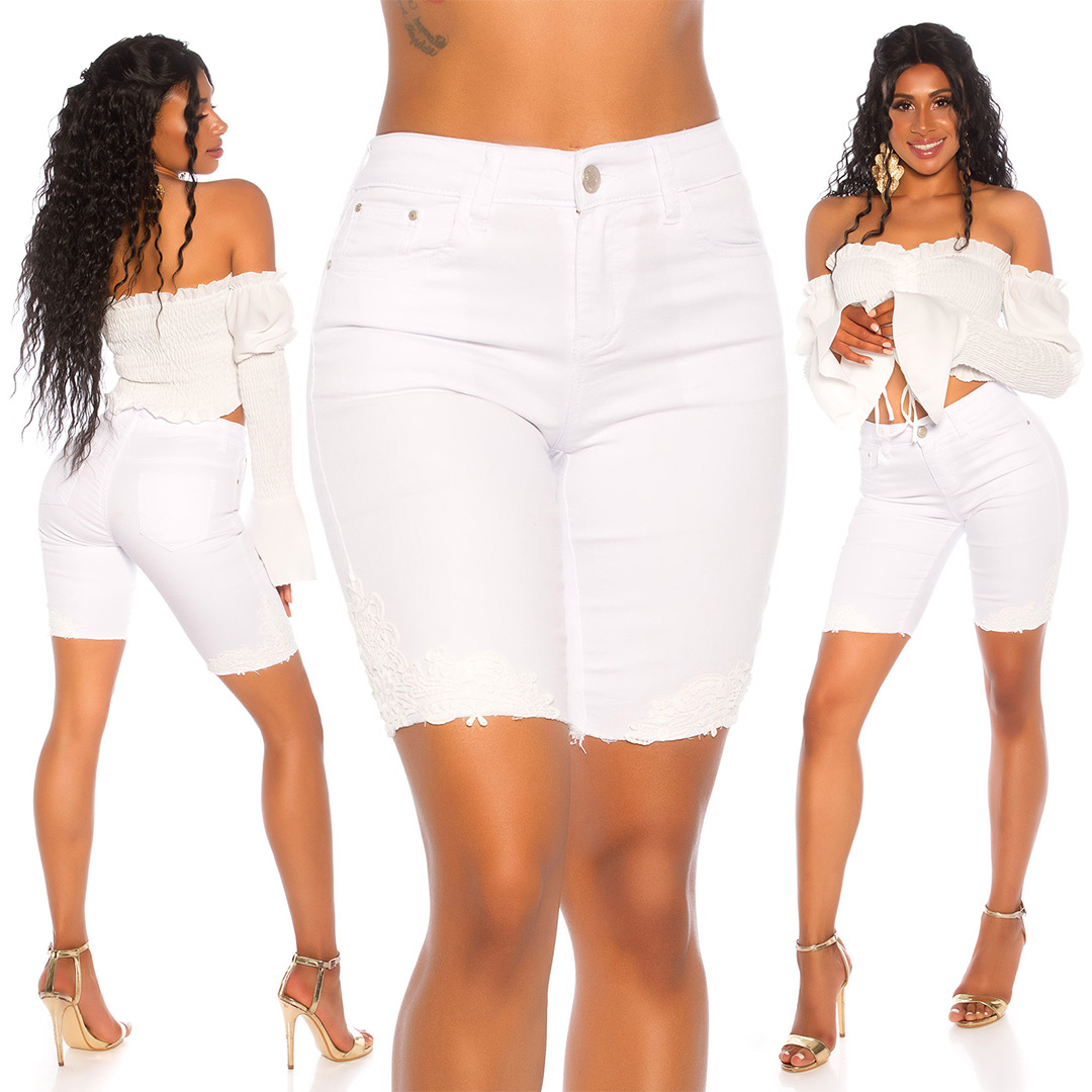 Pantaloncino di jeans bianco elasticizzato con riporti in pizzo bianco