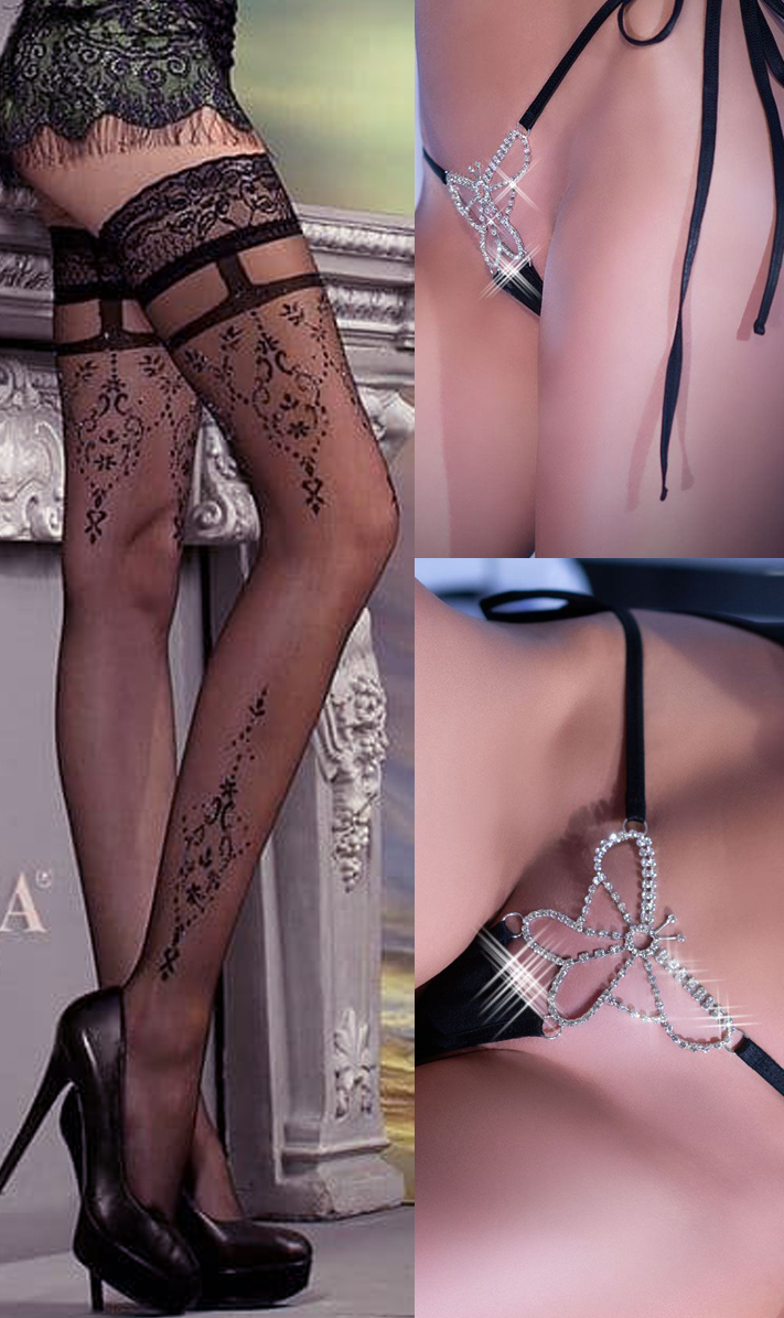Un idea regalo davvero romantica: perizoma gioiello, con calze autoreggenti . Dai unโocchiata a questi fantastici dettagli: Calze autoreggenti nere con balza in pizzo siliconata e disegno effetto reggicalze con raffinati ricami su cosce e polpacci arricchiti da luccicanti fili in lurex. Filato setificato da 20 denari con punte rinforzate. 82% poliammidica 18% elastan Sexy perizoma con bijoux a forma di farfalla, formato da tanti strass scintillanti. Piccolo triangolo di tessuto coprente nella parte sottostante. Lacci da legare sui fianchi per regolare la larghezza. Un capo di lingerie davvero da sogno, che stuzzica la fantasia per inventare i tuoi giochi…