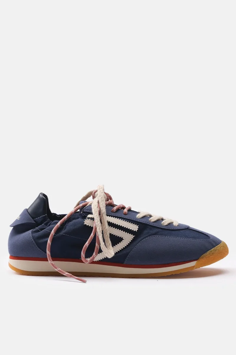 blue navy nylon and microsuede with off white logo and blue navy details. brown, light beige and honey outsole, double brown and light beige laces.