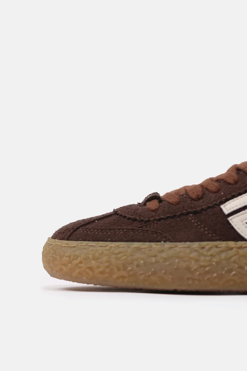 Hairy microsuede dark brown, logo white and detail black. Outsole honey, double lace brown and white. Vintage finishing.