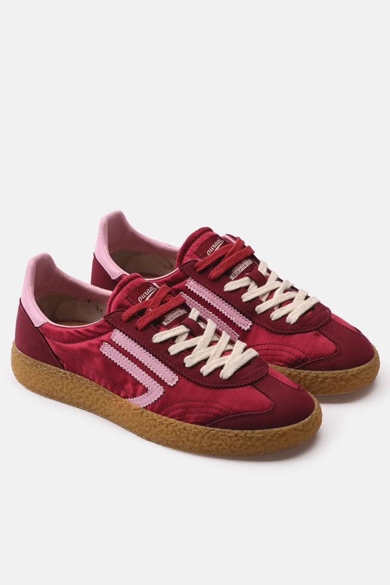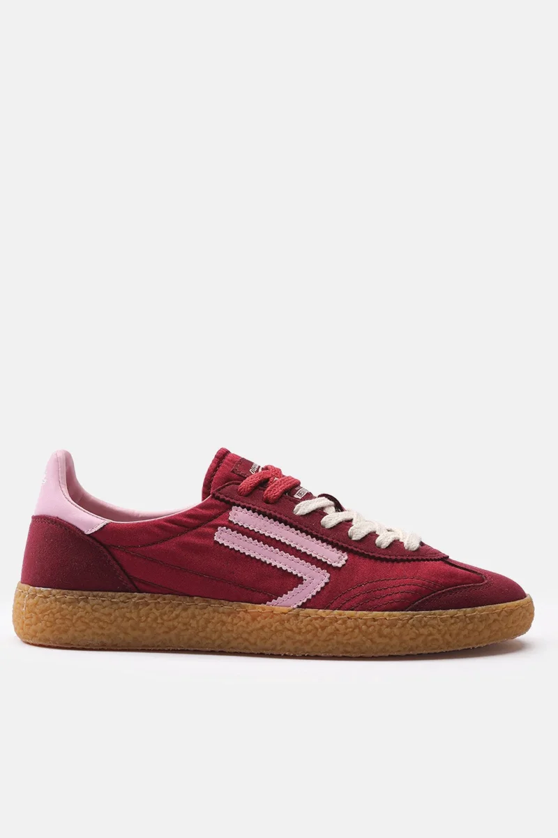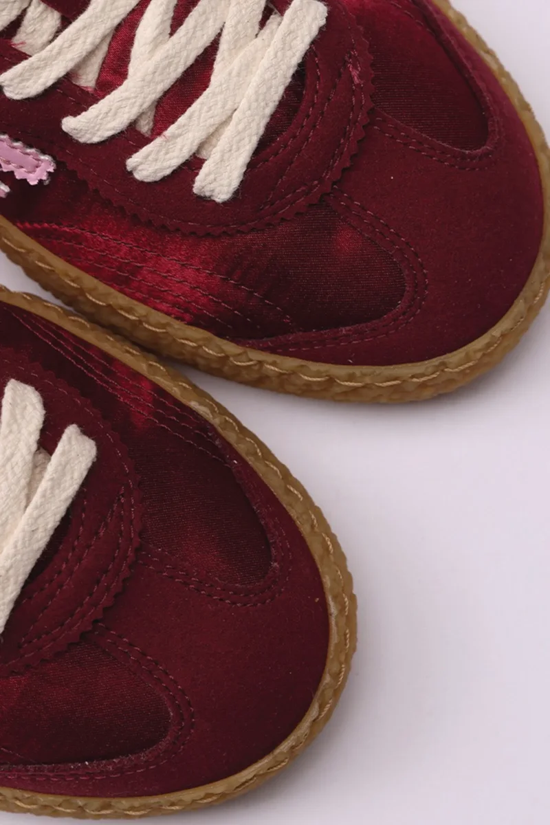 bordeaux satin and microsuede with pink logo and details. Amber outsole and double bordeaux and ivory laces