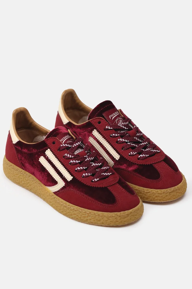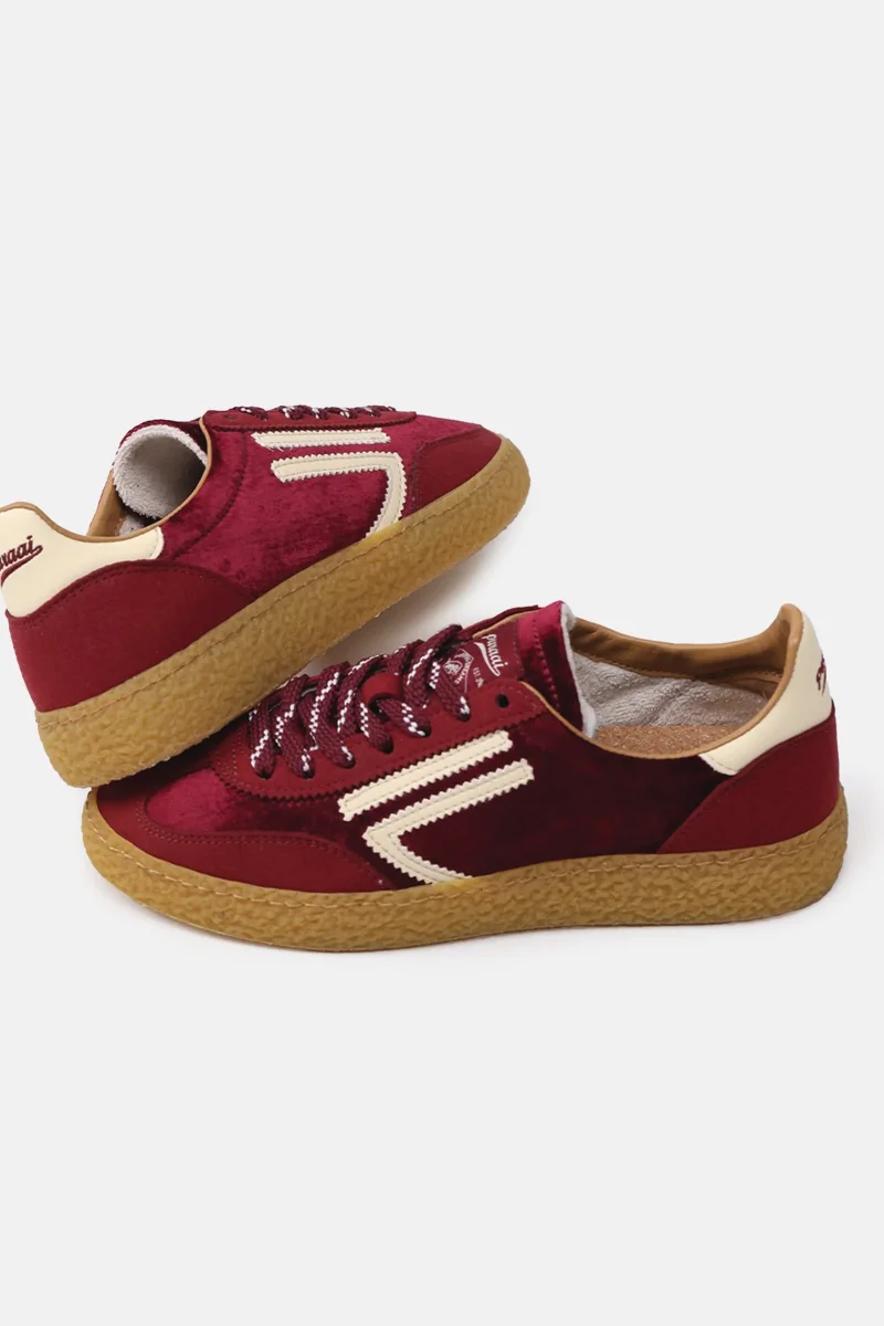 Microsuede and velvet bordeaux, logo and detail butter. Outsole honey, lace white and bordeaux.