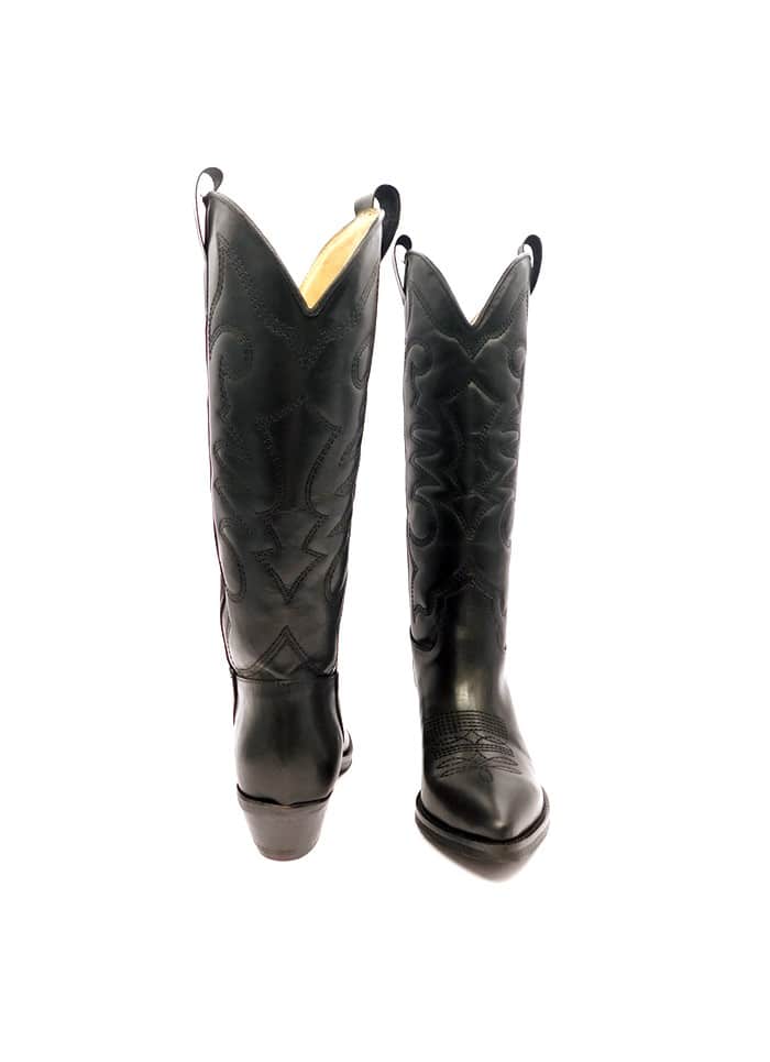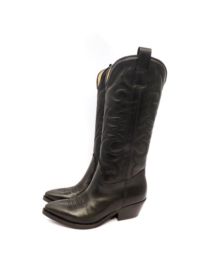 Texano in vitello ricamato nero. Interno in pelle. Tacco 3 cm. Fondo in cuoio.
