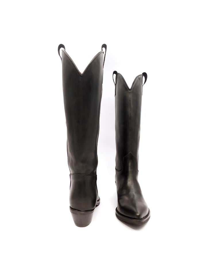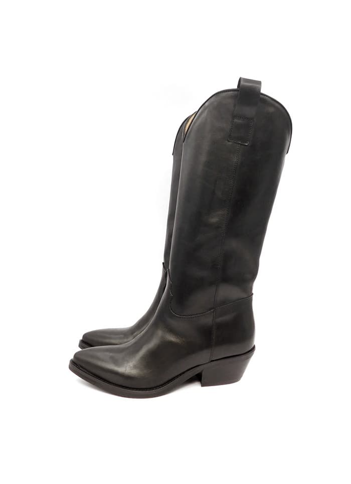 Texano in vitello nero. Interno in pelle. Tacco 3 cm. Fondo in cuoio.