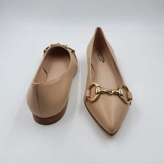Ballerina in vitello beige, con accessorio oro. Interno in pelle. Fondo in cuoio.