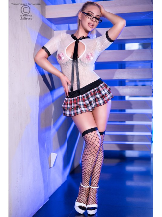 Completoย di tutti gli accessori, comprende:ย body bianco trasparente, minigonna,ย calze a rete, occhiali e copri capezzoli.