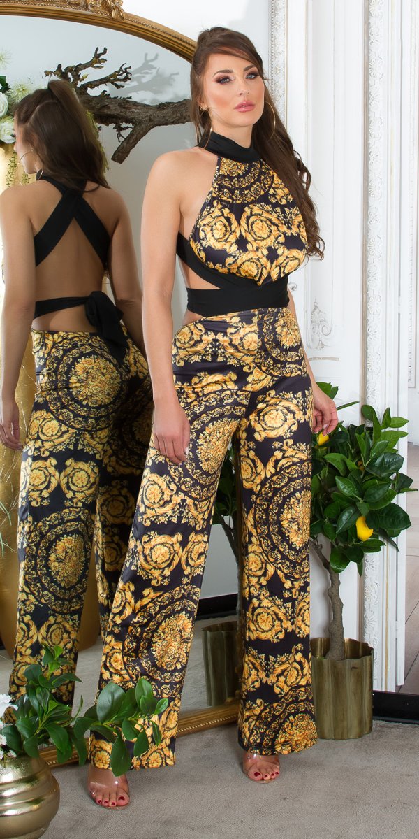 Una tuta combinata in un mix di eleganza e sensualitร , con motivo floreale color nero e oro, chiusura posteriore a fasce e pantaloni a zampa dโelefante.