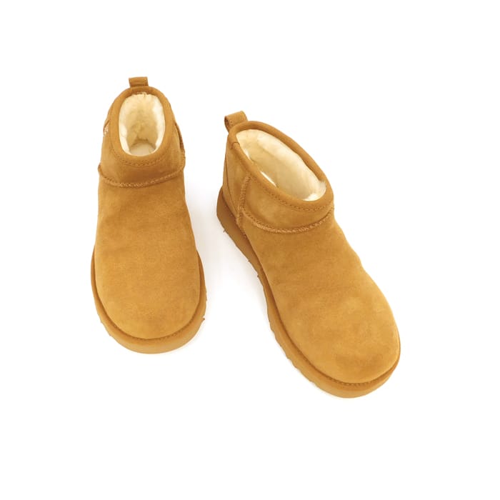 Tronchetto con tomaia in pelle scamosciata con banda di strass laterale. Interno in lana. Soletta interna in lana. Suola in gomma Eva.