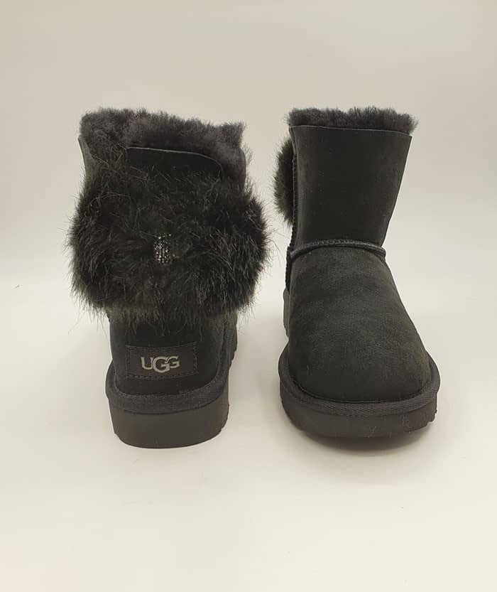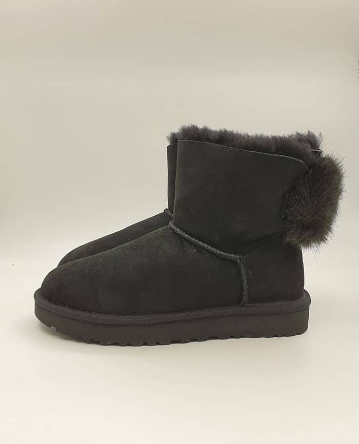 Polacco in camoscio nero con fiocco lapin. Interno in pelo. Fondo in gomma.
