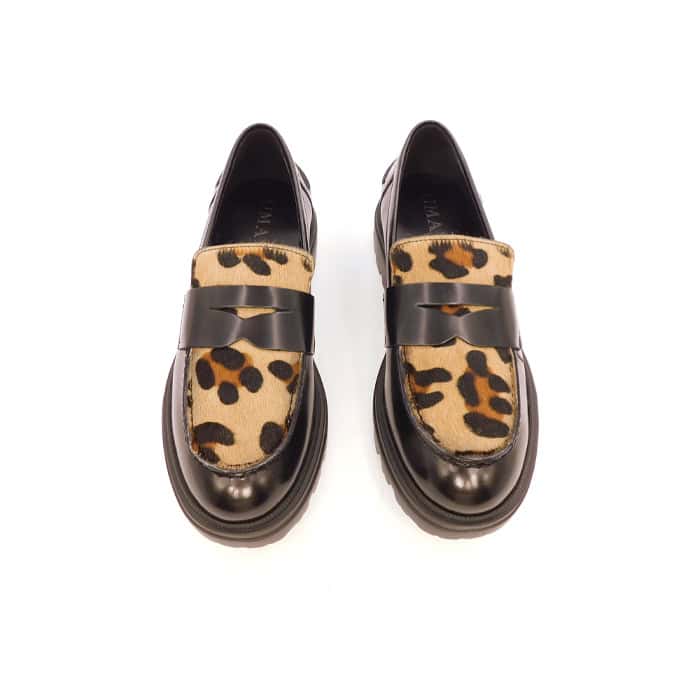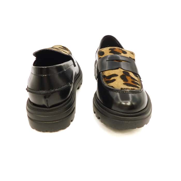 Mocassino in vitello nero spazzolato ed inserto in cavallino animalier. Interno in pelle. Fondo in gomma Extralight.