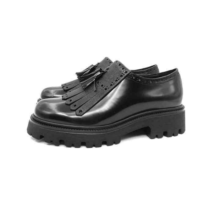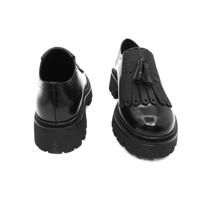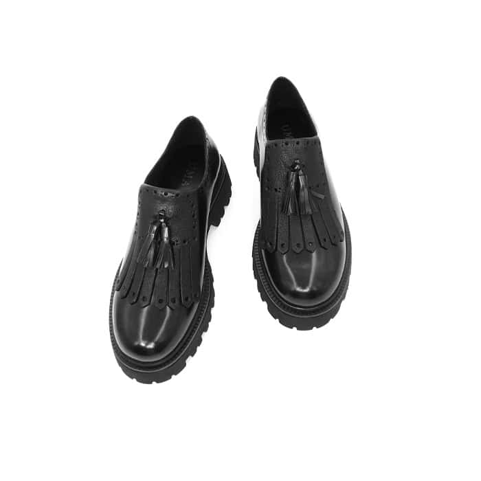 Scarpa senza lacci in vitello nero con dettaglio frangia e mappo. Interno in pelle. Fondo in gomma.