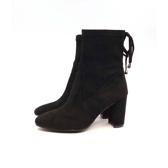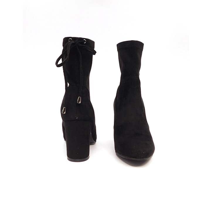 Tronchetto in eco suede nero elasticizzato alla caviglia. Punta tonda. Laccio sul retro. Tacco 7 cm.