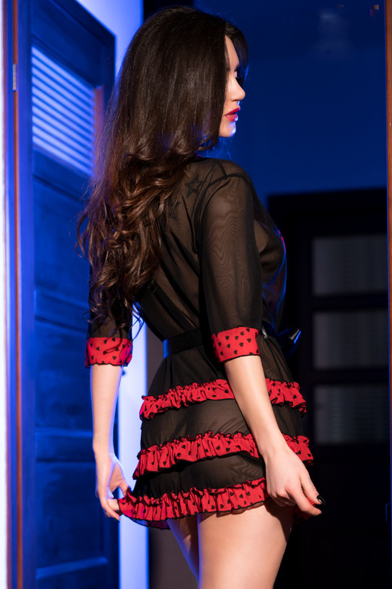 Vestaglia sexy corta in mordida microrete impreziosita da bordature e balze rosse con cuoricini. Maniche a 3/4 e cintura in raso da legare in vita. Include perizoma in coordinato