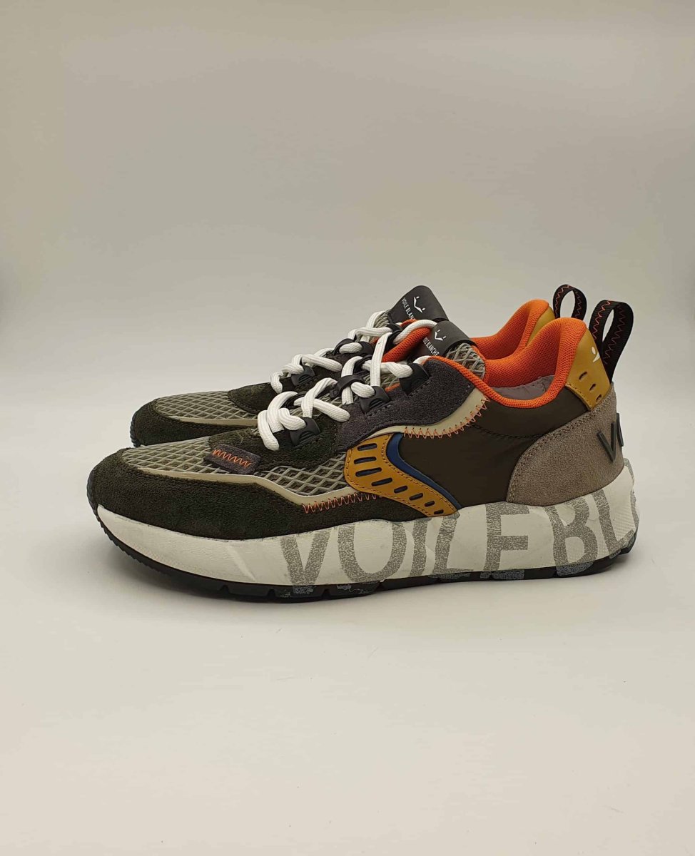Sneaker in tessuto tecnico e camoscio verde militare. Interno in pelle. Fondo zeppa logato 2 cm in gomma.